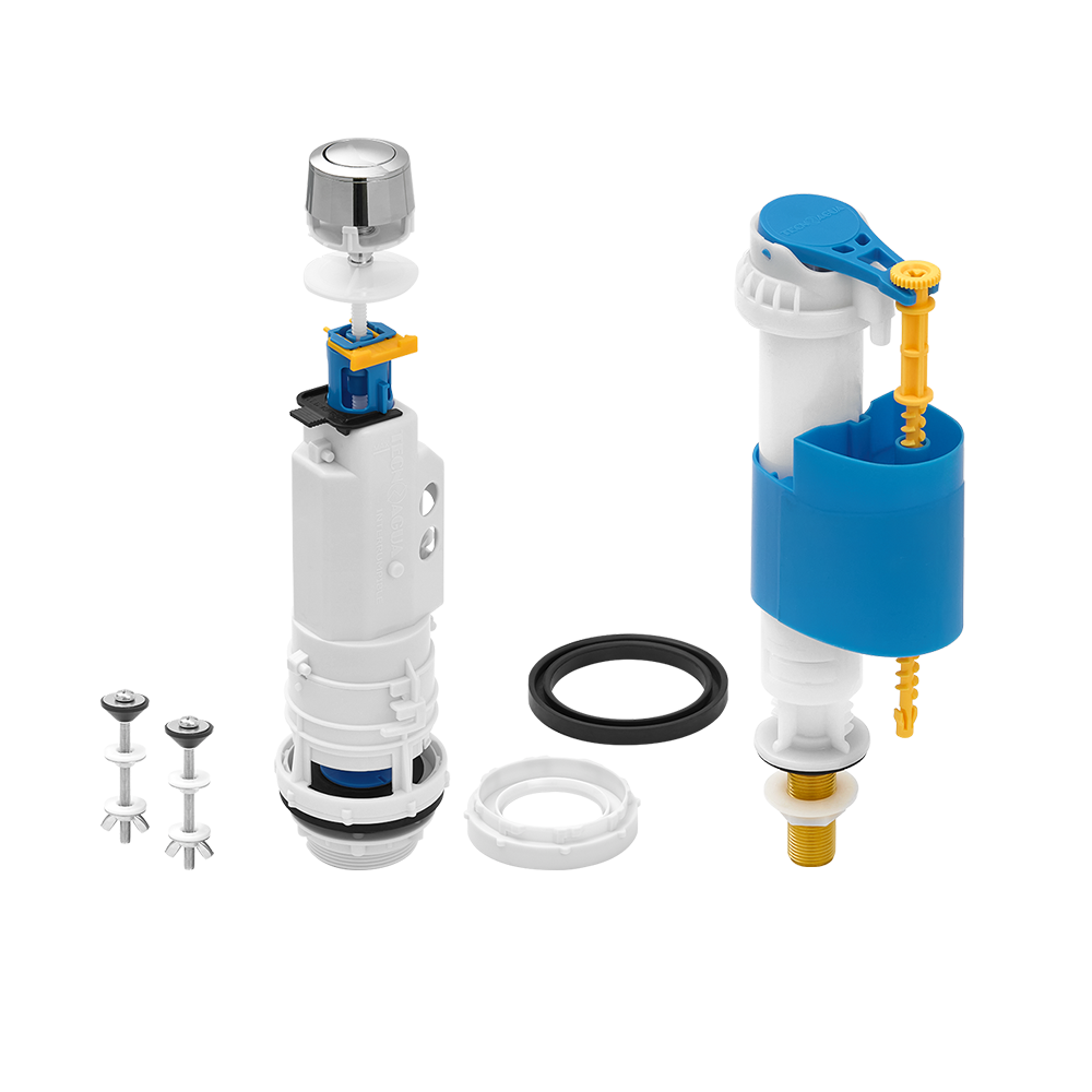 Nuevo MECANISMO UNIVERSAL SIMPLE DESCARGA PULSADOR INTERRUMPIBLE de TECNOAGUA T-281+ junto con FLOTADOR VERTICAL COMPACTO T-451